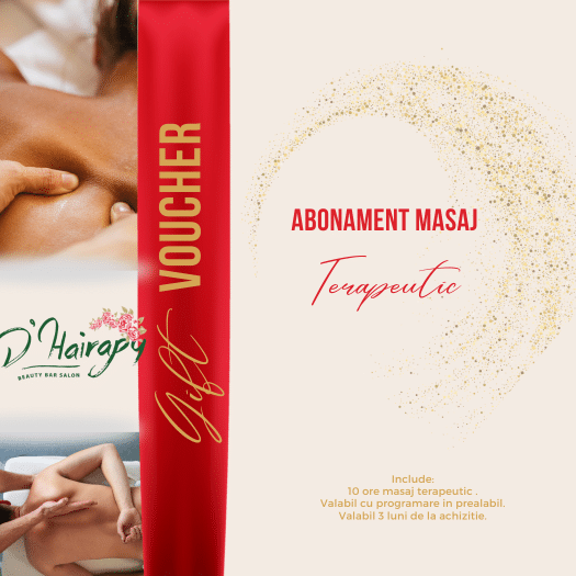 Abonamentul pentru 10 ședințe de masaj terapeutic la D’Hairapy Beauty Bar din București vă oferă oportunitatea de a vă concentra asupra sănătății și bunăstării dvs. Fiecare ședință este special concepută pentru a aduce reînnoire și vindecare în corpul și mintea dvs. Utilizând tehnici terapeutice profesioniste, acest abonament vă oferă o experiență personalizată de masaj terapeutic pentru a aborda nevoile dvs. individuale.