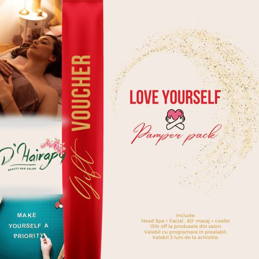 În fiecare zi merităm să ne oprim din rutina agitată și să ne acordăm momente de pură relaxare și răsfăț. La D’Hairapy Beauty Bar, credem în puterea frumuseții de a transforma și de a reînnoi. De aceea, am creat special pentru tine Love Yourself Pamper Pack, un pachet de servicii exclusiv, destinat să te învăluie într-o experiență de neuitat, în care să te reconectezi cu tine și să îți celebrezi frumusețea interioară și exterioară.